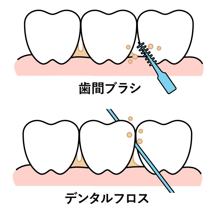 歯周病対策としては、何よりもまずはご自宅での歯磨きをしっかりとしましょう。また、歯ブラシだけでなくデンタルフロスや歯間ブラシを使うことによってより効果的なセルフケアができます。歯科医院での歯磨き指導を受けることをオススメします。